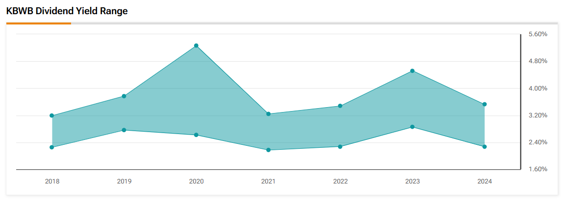 - KBWB의 배당 수익률은 2018년부터 2024년까지 큰 변동성을 보였으며, 특히 2020년과 2023년에 피크를 기록함.
