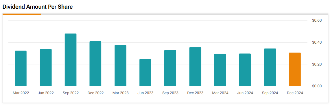 - 2024년 12월 배당금은 이전 분기보다 낮아졌으나, 장기적으로 안정적인 배당 추세를 유지 중임.