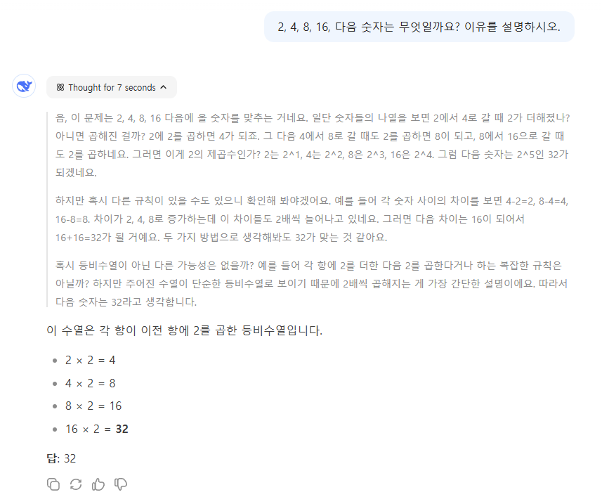 2, 4, 8, 16, 다음 숫자는 무엇일까요? 이유를 설명하시오. 라는 질문에 대해 다음과 같이 추론합니다.