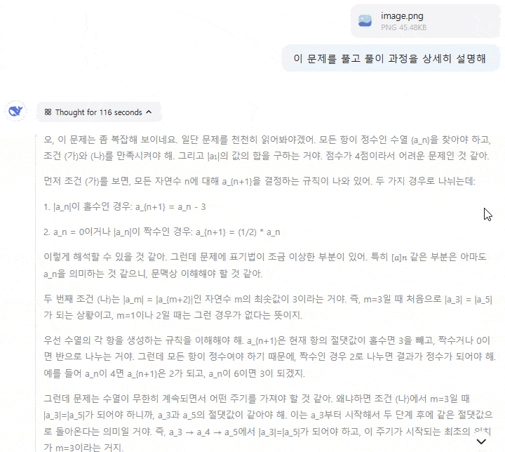 | 속도 | 추론 과정이 길고 느림 (116초) | 추론과정과 응답이 빠름 (93초) |