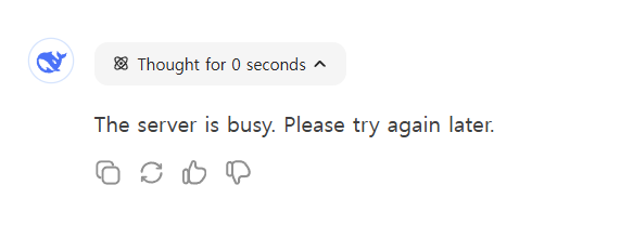 이러한 경우에는 딥시크 측에서 안정화하거나 사용자가 줄어들 때까지 기다리는 수 밖에 없습니다.