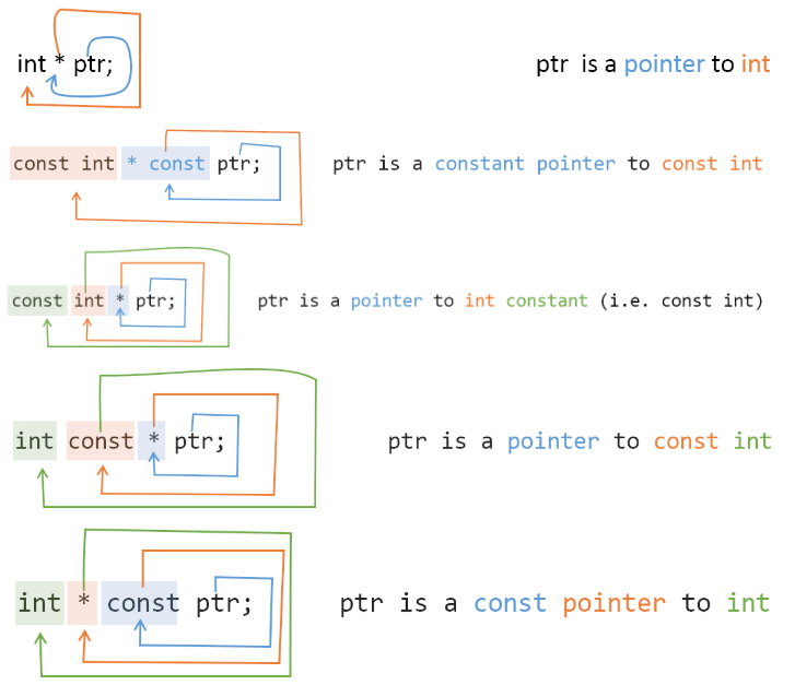 아래 이미지는 const와 포인터 선언의 관계를 명확히 보여줍니다: